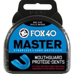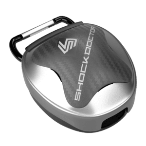 Heavy-duty ventilated case with athletic bag attachment system provides secure, clean storage for your mouthguard.