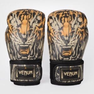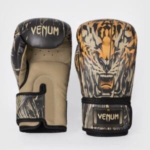 The hunt is on. Venum Tiger is a full range of combat sports gear and performance apparel inspired by the power, agility and courage of this most fearsome predator.Featuring a triple density foam, these Venum boxing gloves offer optimal shock absorption and effective protection for your hands. A hook-and-loop closure system provides custom wrist support for an explosive punch, time after time. The striking design of the Venum Tiger Boxing Gloves captures the unbounded ferocity of a wild cat, mid hunt. This is the perfect glove for athletes with that savage edge.Pair yours with the performance apparel from the same collection.
